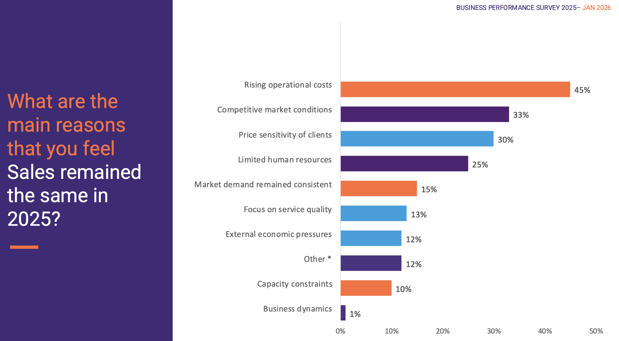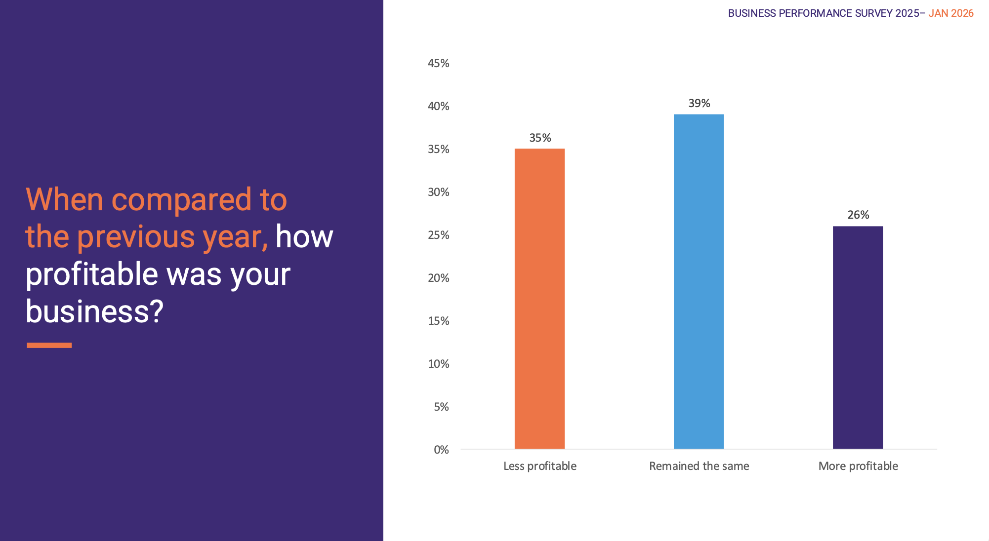 When compared to 2024, 43% of businesses reported an increase in turnover during 2025, while 31% stated sales remained the same, and 26% experienced a decrease. This reflects a slight improvement compared to the previous year.